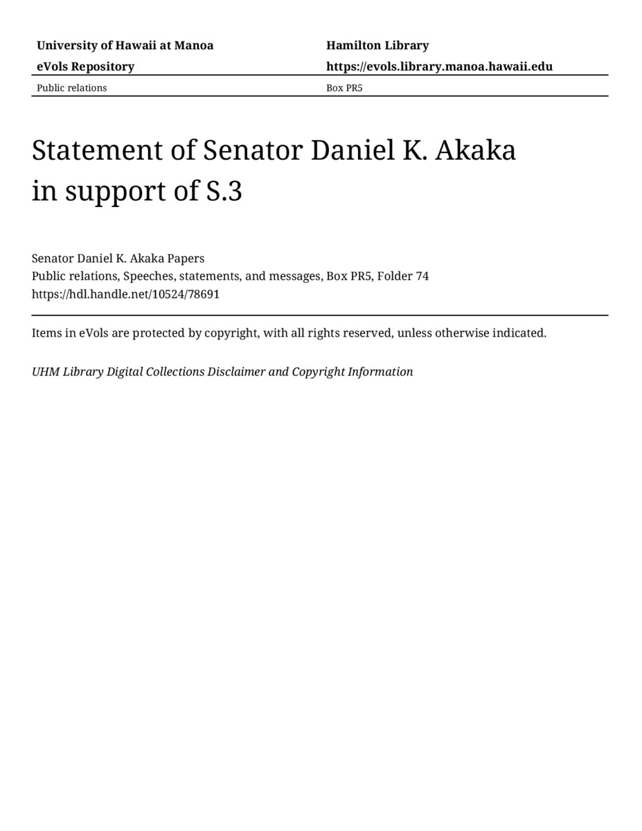 Statement of Senator Daniel K. Akaka in support of S.3, June 10, 1993, MANUSCRIPT-HCPC00010, Public relations, Speeches, statements, and messages, Box PR5, Folder 74, Senator Daniel K. Akaka Papers, Hawaiʻi Congressional Papers Collection, University of Hawaiʻi at Mānoa Library, Honolulu, HI. https://congressarchives.org/catalog/10524_78691 (accessed March 17, 2026).