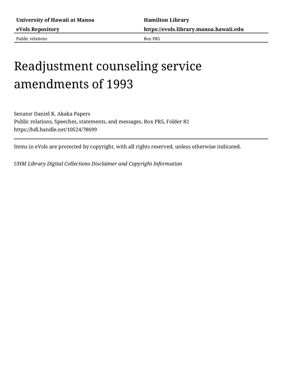 Readjustment counseling service amendments of 1993, July 14, 1993, MANUSCRIPT-HCPC00010, Public relations, Speeches, statements, and messages, Box PR5, Folder 82, Senator Daniel K. Akaka Papers, Hawaiʻi Congressional Papers Collection, University of Hawaiʻi at Mānoa Library, Honolulu, HI. https://congressarchives.org/catalog/10524_78699 (accessed March 21, 2026).