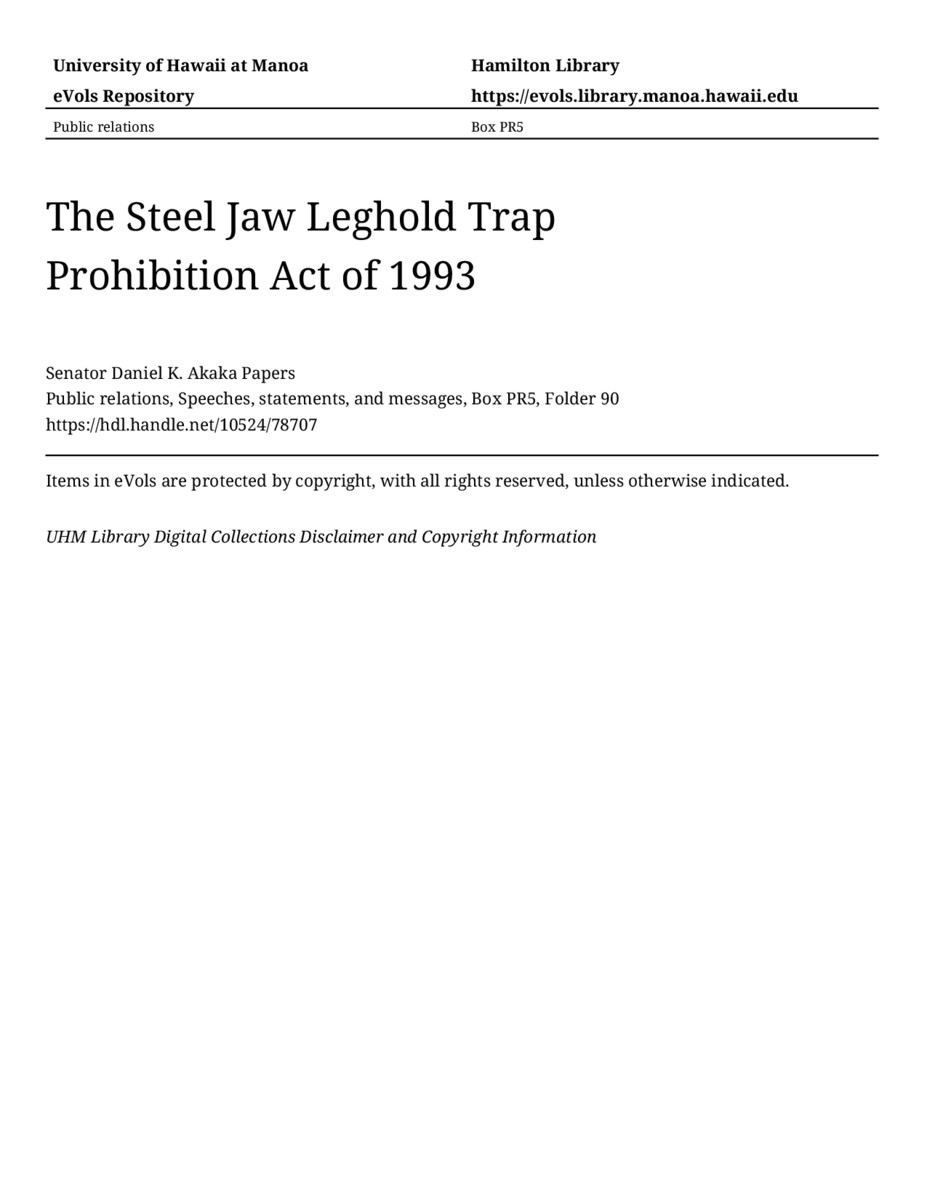 The Steel Jaw Leghold Trap Prohibition Act of 1993, August 3, 1993, MANUSCRIPT-HCPC00010, Public relations, Speeches, statements, and messages, Box PR5, Folder 90, Senator Daniel K. Akaka Papers, Hawaiʻi Congressional Papers Collection, University of Hawaiʻi at Mānoa Library, Honolulu, HI. https://congressarchives.org/catalog/10524_78707 (accessed March 20, 2026).