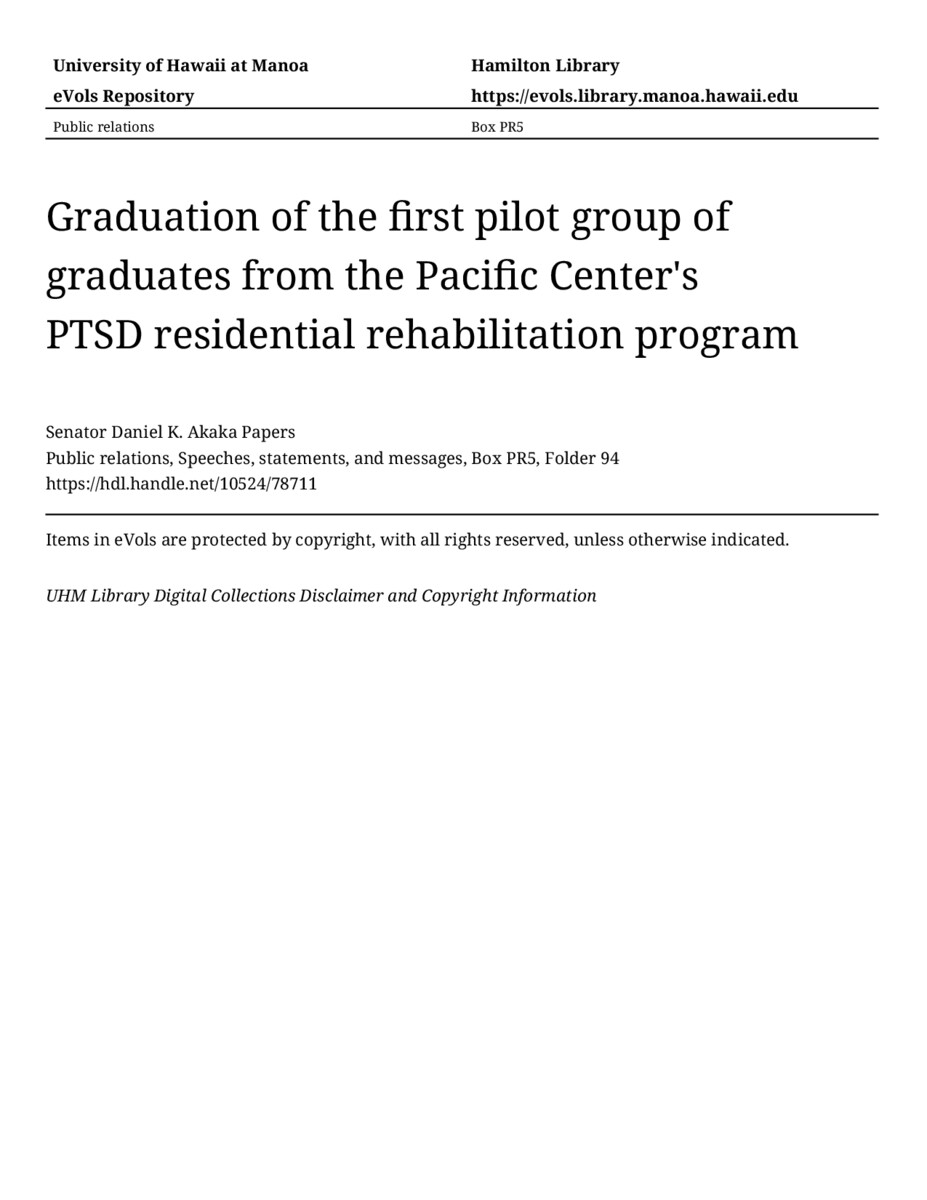 Graduation of the first pilot group of graduates from the Pacific Center's PTSD residential rehabilitation program, August 12, 1993, MANUSCRIPT-HCPC00010, Public relations, Speeches, statements, and messages, Box PR5, Folder 94, Senator Daniel K. Akaka Papers, Hawaiʻi Congressional Papers Collection, University of Hawaiʻi at Mānoa Library, Honolulu, HI. https://congressarchives.org/catalog/10524_78711 (accessed March 20, 2026).