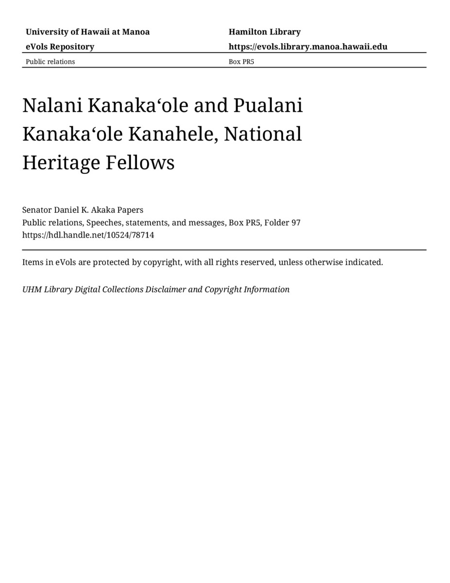 - Nalani Kanakaʻole and Pualani Kanakaʻole Kanahele, National Heritage Fellows