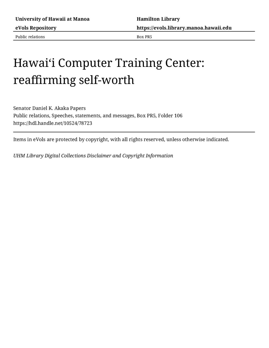 Hawaiʻi Computer Training Center: reaffirming self-worth, November 18, 1993, MANUSCRIPT-HCPC00010, Public relations, Speeches, statements, and messages, Box PR5, Folder 106, Senator Daniel K. Akaka Papers, Hawaiʻi Congressional Papers Collection, University of Hawaiʻi at Mānoa Library, Honolulu, HI. https://congressarchives.org/catalog/10524_78723 (accessed March 20, 2026).