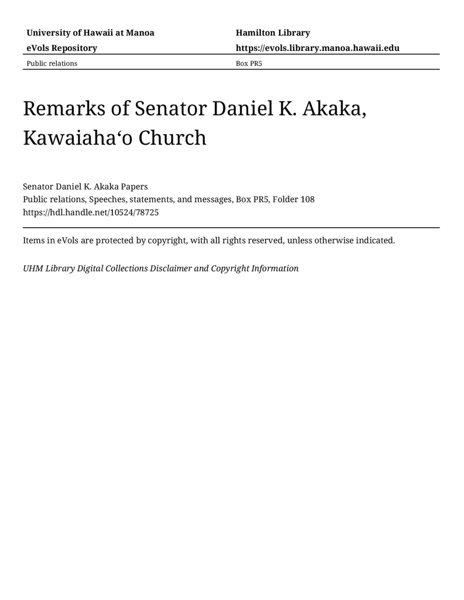Remarks of Senator Daniel K. Akaka, Kawaiahaʻo Church, December 29, 1993, MANUSCRIPT-HCPC00010, Public relations, Speeches, statements, and messages, Box PR5, Folder 108, Senator Daniel K. Akaka Papers, Hawaiʻi Congressional Papers Collection, University of Hawaiʻi at Mānoa Library, Honolulu, HI. https://congressarchives.org/catalog/10524_78725 (accessed March 19, 2026).