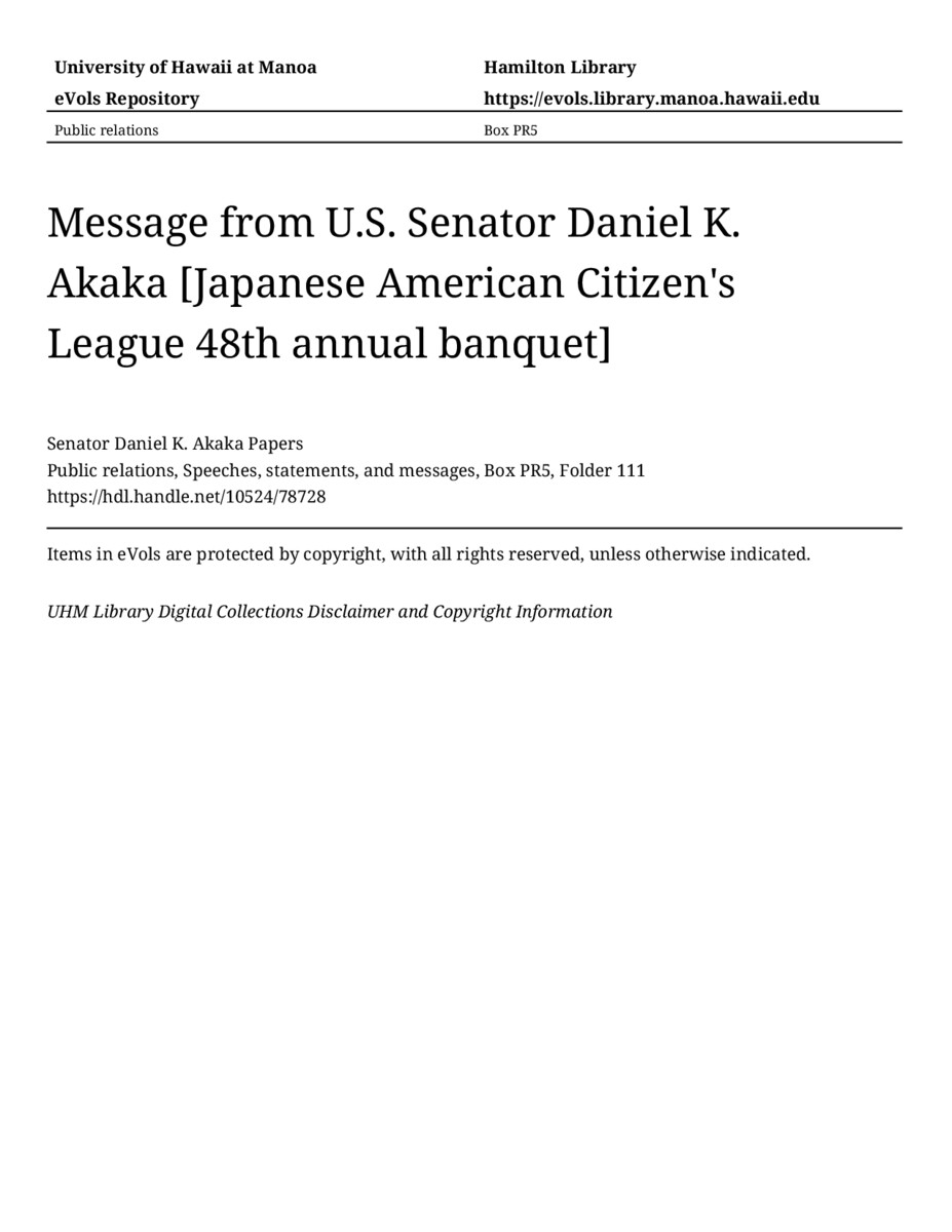 - Message from U.S. Senator Daniel K. Akaka [Japanese American Citizen's League 48th annual banquet]