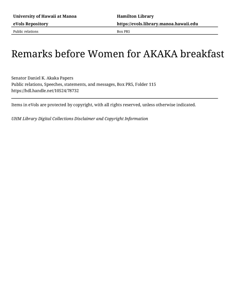 Remarks before Women for AKAKA breakfast, February 16, 1994, MANUSCRIPT-HCPC00010, Public relations, Speeches, statements, and messages, Box PR5, Folder 115, Senator Daniel K. Akaka Papers, Hawaiʻi Congressional Papers Collection, University of Hawaiʻi at Mānoa Library, Honolulu, HI. https://congressarchives.org/catalog/10524_78732 (accessed March 21, 2026).