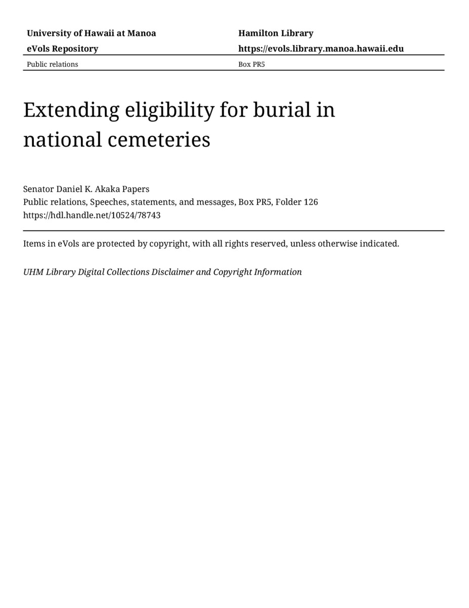 Extending eligibility for burial in national cemeteries, April 20, 1994, MANUSCRIPT-HCPC00010, Public relations, Speeches, statements, and messages, Box PR5, Folder 126, Senator Daniel K. Akaka Papers, Hawaiʻi Congressional Papers Collection, University of Hawaiʻi at Mānoa Library, Honolulu, HI. https://congressarchives.org/catalog/10524_78743 (accessed March 21, 2026).