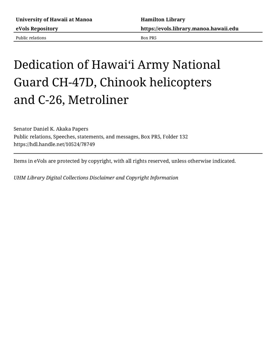 - Dedication of Hawaiʻi Army National Guard CH-47D, Chinook helicopters and C-26, Metroliner