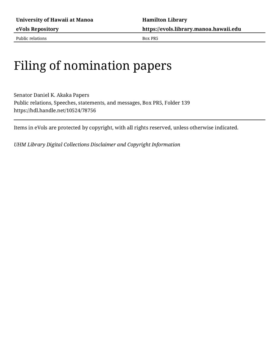 Filing of nomination papers, July 8, 1994, MANUSCRIPT-HCPC00010, Public relations, Speeches, statements, and messages, Box PR5, Folder 139, Senator Daniel K. Akaka Papers, Hawaiʻi Congressional Papers Collection, University of Hawaiʻi at Mānoa Library, Honolulu, HI. https://congressarchives.org/catalog/10524_78756 (accessed March 21, 2026).