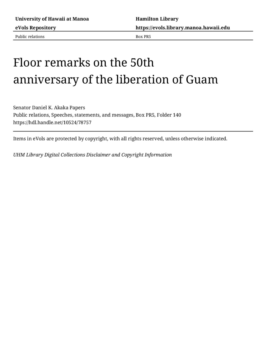 - Floor remarks on the 50th anniversary of the liberation of Guam
