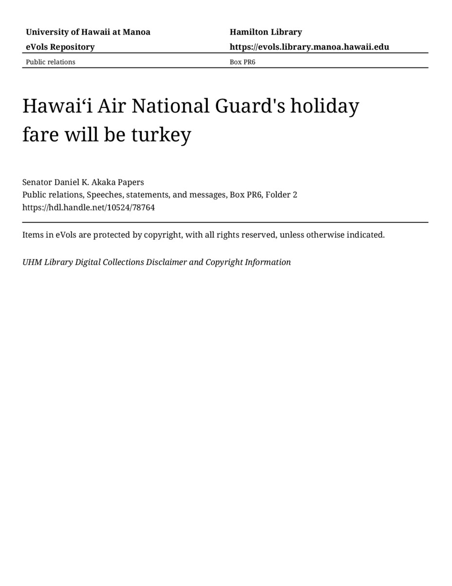 Hawaiʻi Air National Guard's holiday fare will be turkey, December 1, 1994, MANUSCRIPT-HCPC00010, Public relations, Speeches, statements, and messages, Box PR6, Folder 2, Senator Daniel K. Akaka Papers, Hawaiʻi Congressional Papers Collection, University of Hawaiʻi at Mānoa Library, Honolulu, HI. https://congressarchives.org/catalog/10524_78764 (accessed March 20, 2026).