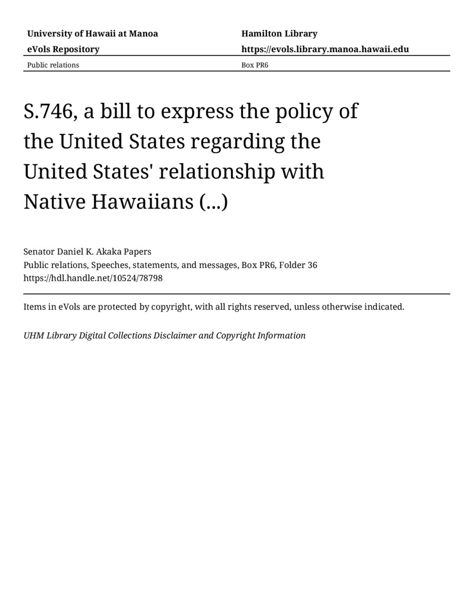 S.746, a bill to express the policy of the United States regarding the United States' relationship with Native Hawaiians (...), April 6, 2001, MANUSCRIPT-HCPC00010, Public relations, Speeches, statements, and messages, Box PR6, Folder 36, Senator Daniel K. Akaka Papers, Hawaiʻi Congressional Papers Collection, University of Hawaiʻi at Mānoa Library, Honolulu, HI. https://congressarchives.org/catalog/10524_78798 (accessed March 19, 2026).