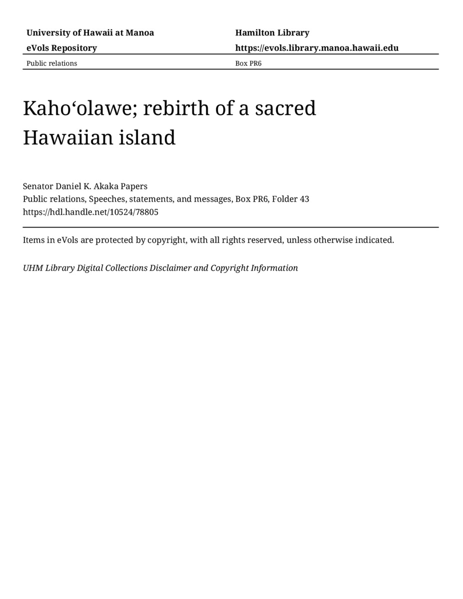 Kahoʻolawe; rebirth of a sacred Hawaiian island, June 10, 2002, MANUSCRIPT-HCPC00010, Public relations, Speeches, statements, and messages, Box PR6, Folder 43, Senator Daniel K. Akaka Papers, Hawaiʻi Congressional Papers Collection, University of Hawaiʻi at Mānoa Library, Honolulu, HI. https://congressarchives.org/catalog/10524_78805 (accessed March 18, 2026).