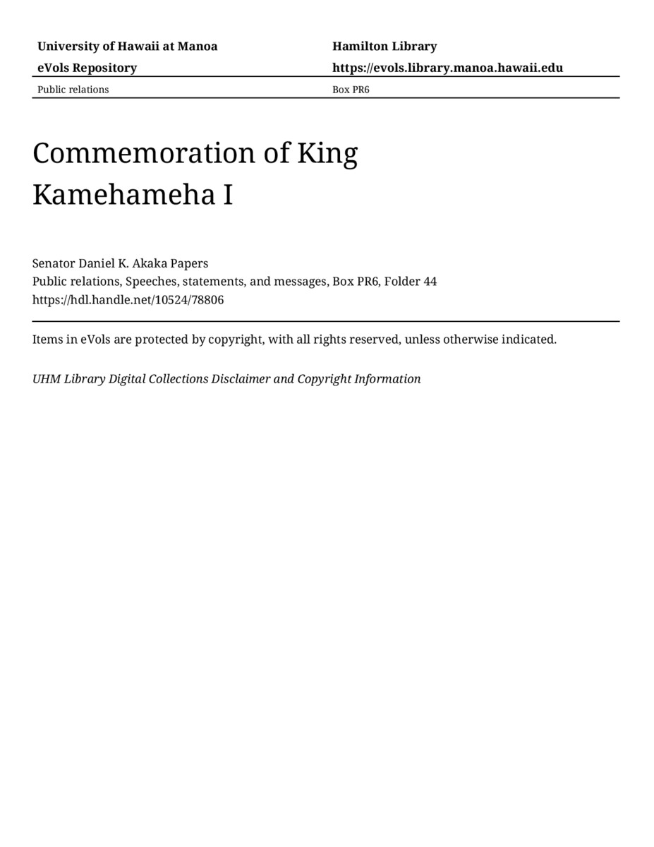 Commemoration of King Kamehameha I, June 11, 2002, MANUSCRIPT-HCPC00010, Public relations, Speeches, statements, and messages, Box PR6, Folder 44, Senator Daniel K. Akaka Papers, Hawaiʻi Congressional Papers Collection, University of Hawaiʻi at Mānoa Library, Honolulu, HI. https://congressarchives.org/catalog/10524_78806 (accessed March 18, 2026).