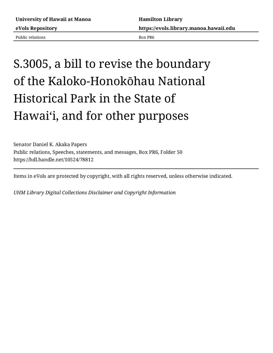 S.3005, a bill to revise the boundary of the Kaloko-Honokōhau National Historical Park in the State of Hawaiʻi, and for other purposes, September 25, 2002, MANUSCRIPT-HCPC00010, Public relations, Speeches, statements, and messages, Box PR6, Folder 50, Senator Daniel K. Akaka Papers, Hawaiʻi Congressional Papers Collection, University of Hawaiʻi at Mānoa Library, Honolulu, HI. https://congressarchives.org/catalog/10524_78812 (accessed March 20, 2026).
