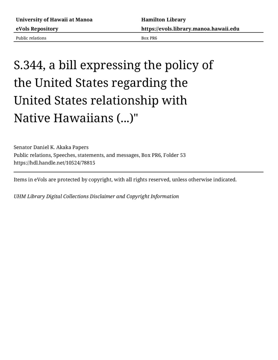 S.344, a bill expressing the policy of the United States regarding the United States relationship with Native Hawaiians (...)", February 11, 2003, MANUSCRIPT-HCPC00010, Public relations, Speeches, statements, and messages, Box PR6, Folder 53, Senator Daniel K. Akaka Papers, Hawaiʻi Congressional Papers Collection, University of Hawaiʻi at Mānoa Library, Honolulu, HI. https://congressarchives.org/catalog/10524_78815 (accessed March 19, 2026).