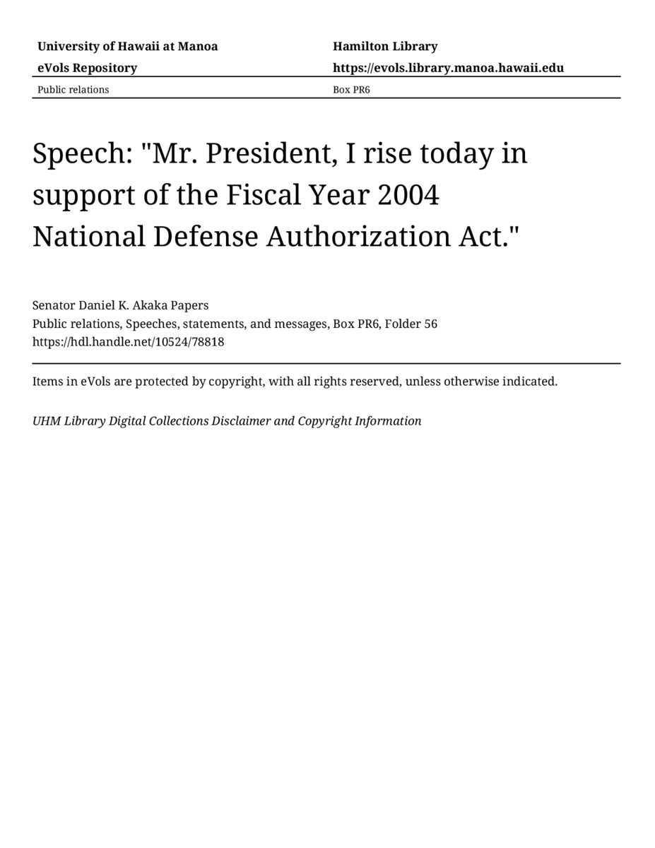 - Speech: "Mr. President, I rise today in support of the Fiscal Year 2004 National Defense Authorization Act."