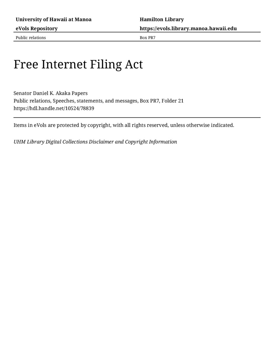 Free Internet Filing Act, approximately 2007, MANUSCRIPT-HCPC00010, Public relations, Speeches, statements, and messages, Box PR7, Folder 21, Senator Daniel K. Akaka Papers, Hawaiʻi Congressional Papers Collection, University of Hawaiʻi at Mānoa Library, Honolulu, HI. https://congressarchives.org/catalog/10524_78839 (accessed March 17, 2026).