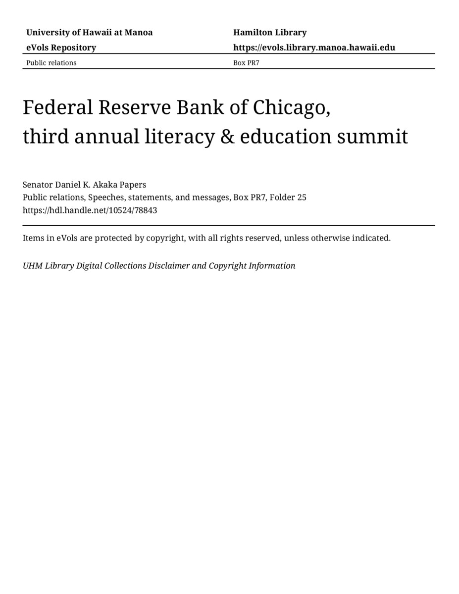- Federal Reserve Bank of Chicago, third annual literacy & education summit