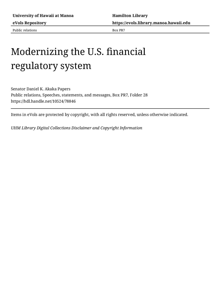 Modernizing the U.S. financial regulatory system, approximately 2009, MANUSCRIPT-HCPC00010, Public relations, Speeches, statements, and messages, Box PR7, Folder 28, Senator Daniel K. Akaka Papers, Hawaiʻi Congressional Papers Collection, University of Hawaiʻi at Mānoa Library, Honolulu, HI. https://congressarchives.org/catalog/10524_78846 (accessed March 19, 2026).