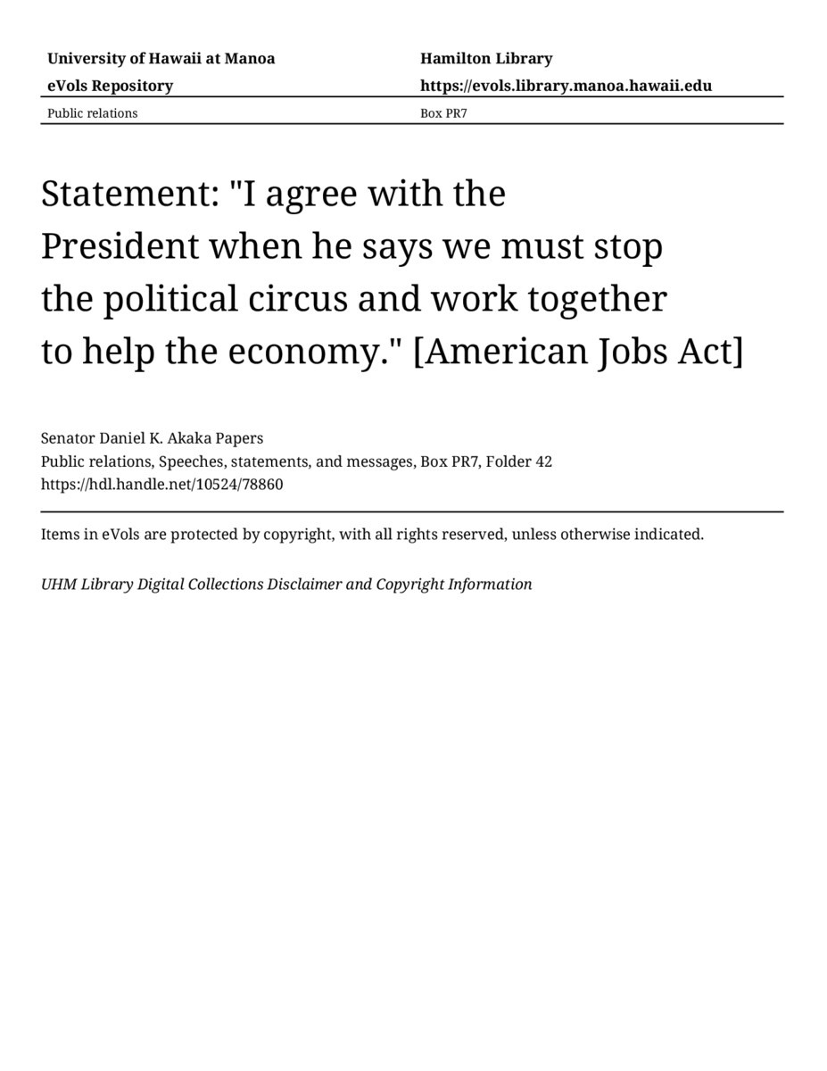 Statement: "I agree with the President when he says we must stop the political circus and work together to help the economy." [American Jobs Act], September 8, 2011, MANUSCRIPT-HCPC00010, Public relations, Speeches, statements, and messages, Box PR7, Folder 42, Senator Daniel K. Akaka Papers, Hawaiʻi Congressional Papers Collection, University of Hawaiʻi at Mānoa Library, Honolulu, HI. https://congressarchives.org/catalog/10524_78860 (accessed March 17, 2026).