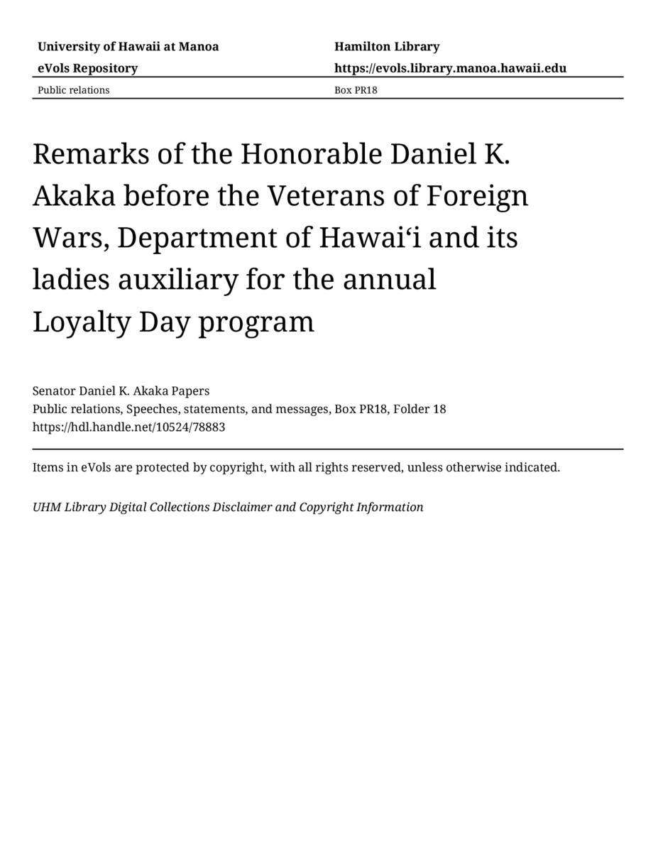 Remarks of the Honorable Daniel K. Akaka before the Veterans of Foreign Wars, Department of Hawaiʻi and its ladies auxiliary for the annual Loyalty Day program, April 29, 1990, MANUSCRIPT-HCPC00010, Public relations, Speeches, statements, and messages, Box PR18, Folder 18, Senator Daniel K. Akaka Papers, Hawaiʻi Congressional Papers Collection, University of Hawaiʻi at Mānoa Library, Honolulu, HI. https://congressarchives.org/catalog/10524_78883 (accessed March 20, 2026).