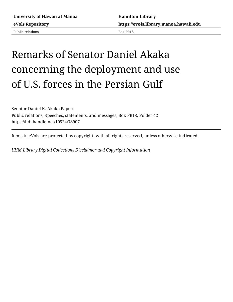 - Remarks of Senator Daniel Akaka concerning the deployment and use of U.S. forces in the Persian Gulf