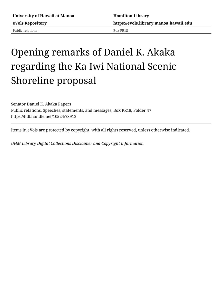 - Opening remarks of Daniel K. Akaka regarding the Ka Iwi National Scenic Shoreline proposal