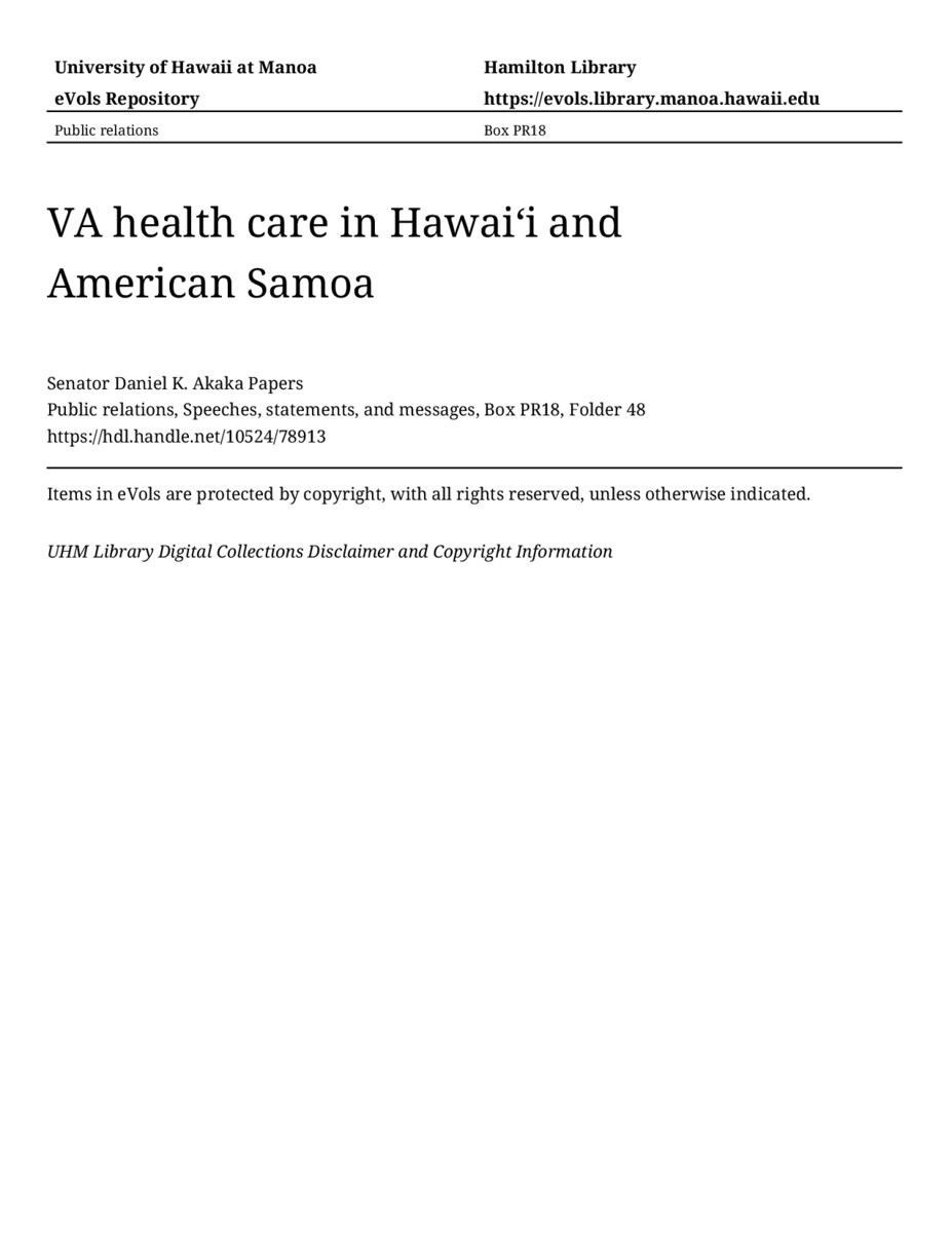 VA health care in Hawaiʻi and American Samoa, August 16, 1991, MANUSCRIPT-HCPC00010, Public relations, Speeches, statements, and messages, Box PR18, Folder 48, Senator Daniel K. Akaka Papers, Hawaiʻi Congressional Papers Collection, University of Hawaiʻi at Mānoa Library, Honolulu, HI. https://congressarchives.org/catalog/10524_78913 (accessed March 21, 2026).