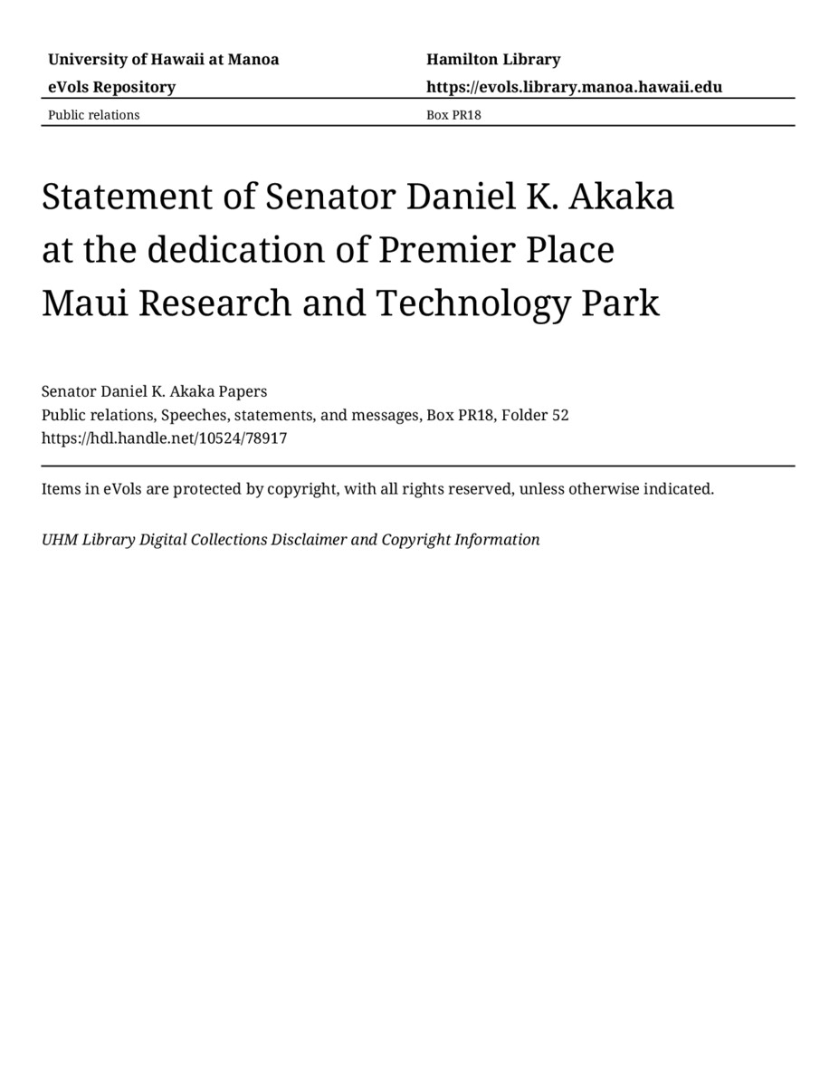 - Statement of Senator Daniel K. Akaka at the dedication of Premier Place Maui Research and Technology Park