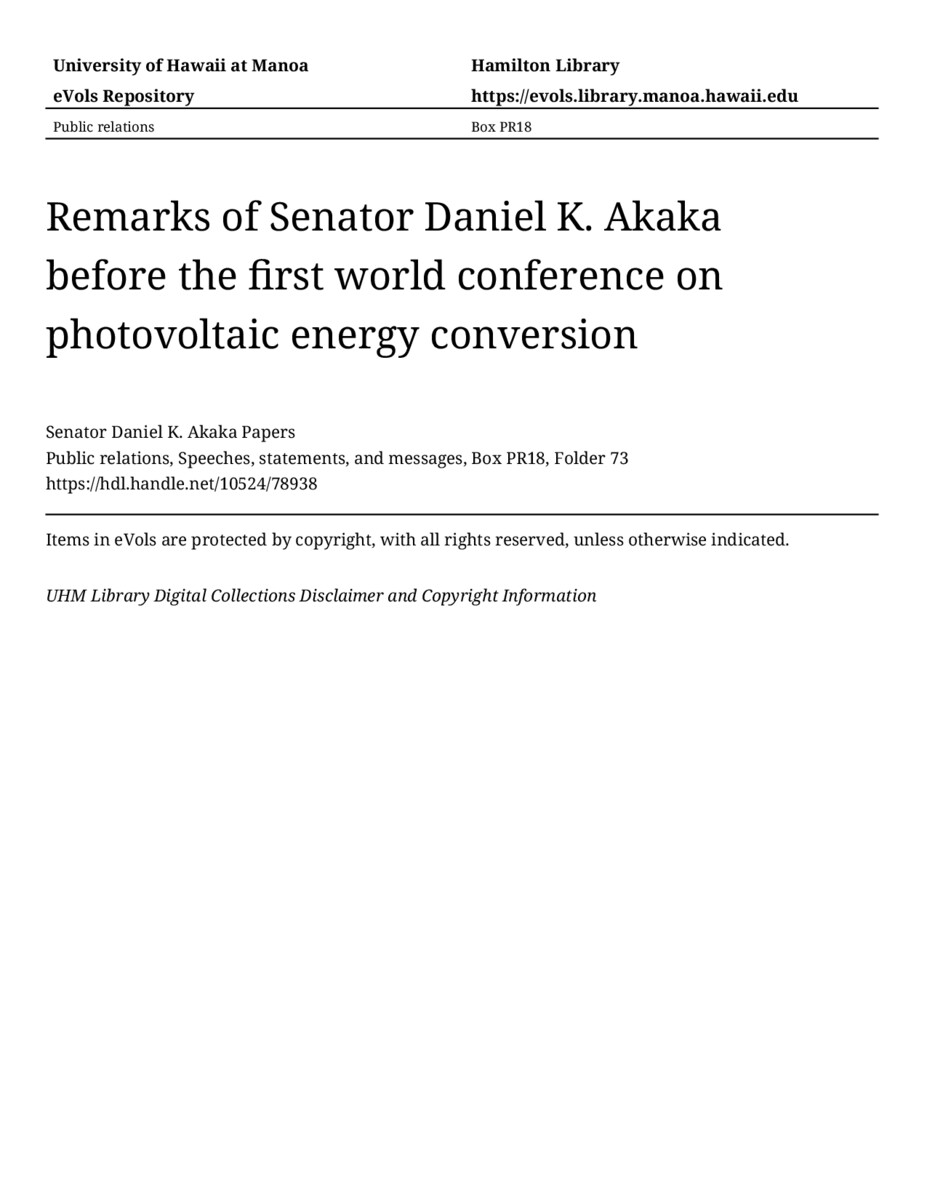 - Remarks of Senator Daniel K. Akaka before the first world conference on photovoltaic energy conversion
