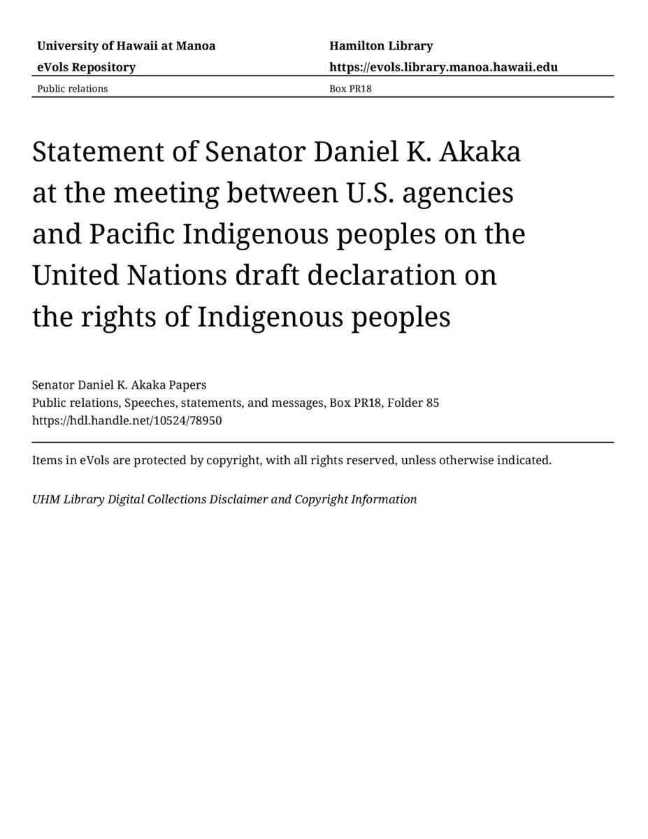 Statement of Senator Daniel K. Akaka at the meeting between U.S. agencies and Pacific Indigenous peoples on the United Nations draft declaration on the rights of Indigenous peoples, August 21, 1996, MANUSCRIPT-HCPC00010, Public relations, Speeches, statements, and messages, Box PR18, Folder 85, Senator Daniel K. Akaka Papers, Hawaiʻi Congressional Papers Collection, University of Hawaiʻi at Mānoa Library, Honolulu, HI. https://congressarchives.org/catalog/10524_78950 (accessed March 18, 2026).