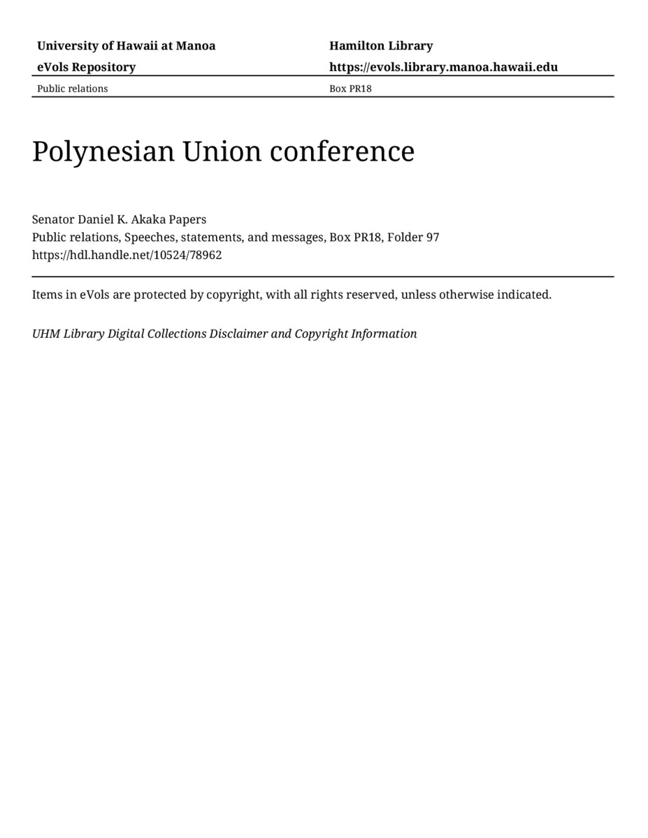 Polynesian Union conference, February 15, 1997, MANUSCRIPT-HCPC00010, Public relations, Speeches, statements, and messages, Box PR18, Folder 97, Senator Daniel K. Akaka Papers, Hawaiʻi Congressional Papers Collection, University of Hawaiʻi at Mānoa Library, Honolulu, HI. https://congressarchives.org/catalog/10524_78962 (accessed March 20, 2026).