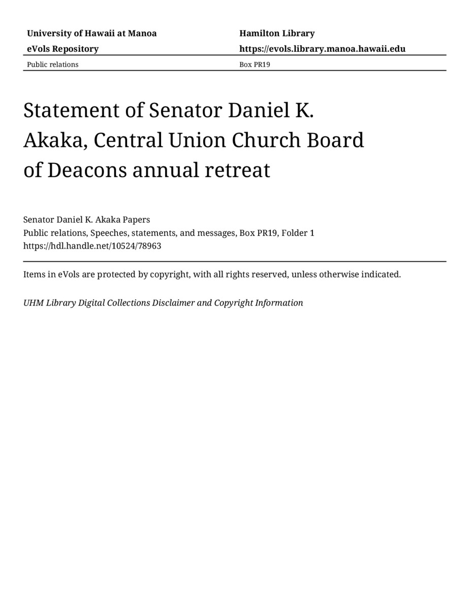 - Statement of Senator Daniel K. Akaka, Central Union Church Board of Deacons annual retreat
