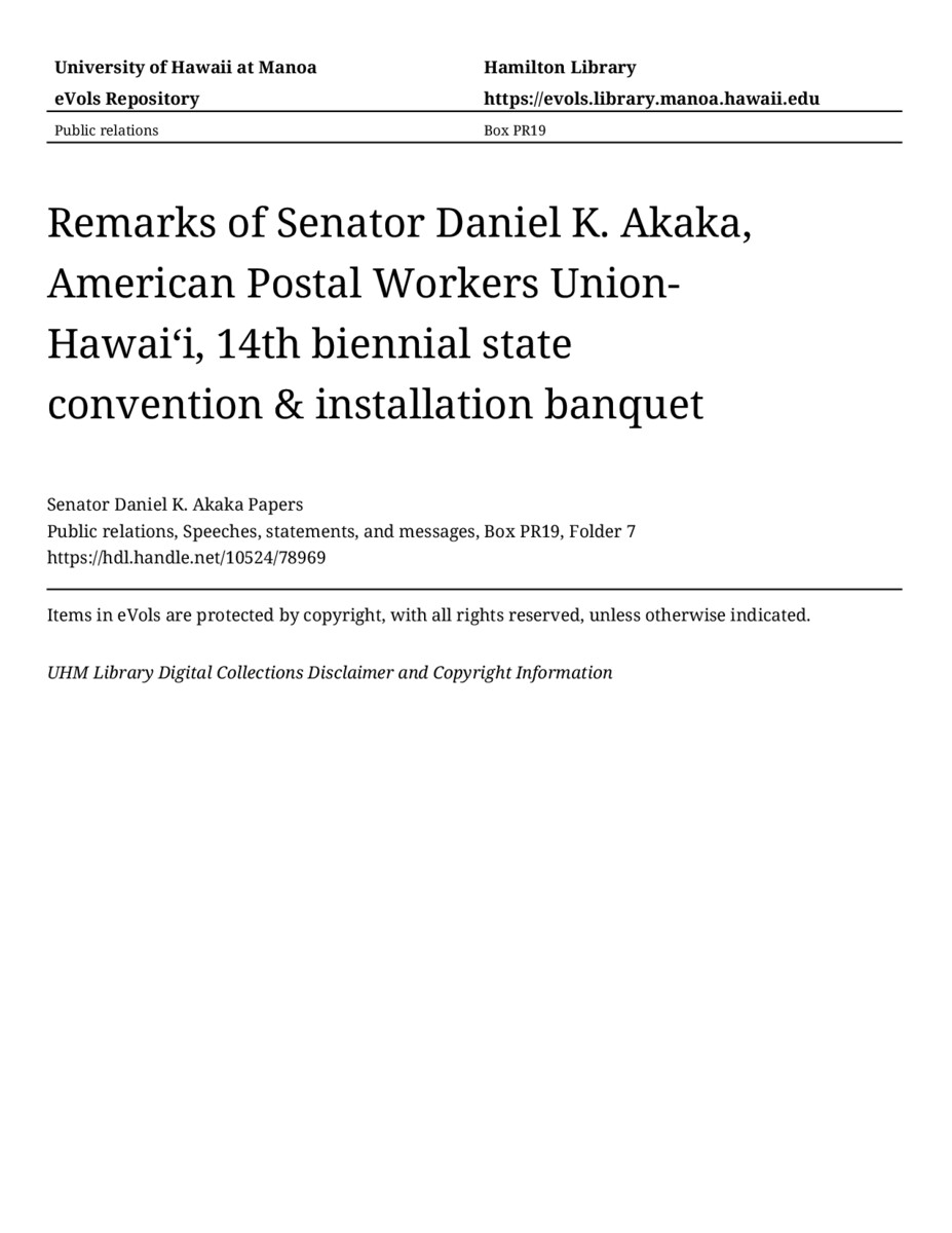 Remarks of Senator Daniel K. Akaka, American Postal Workers Union- Hawaiʻi, 14th biennial state convention & installation banquet, May 24, 1997, MANUSCRIPT-HCPC00010, Public relations, Speeches, statements, and messages, Box PR19, Folder 7, Senator Daniel K. Akaka Papers, Hawaiʻi Congressional Papers Collection, University of Hawaiʻi at Mānoa Library, Honolulu, HI. https://congressarchives.org/catalog/10524_78969 (accessed March 20, 2026).