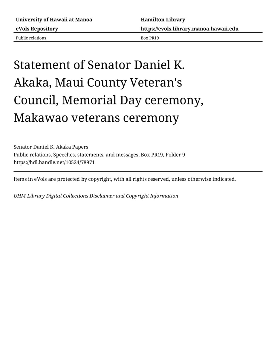 Statement of Senator Daniel K. Akaka, Maui County Veteran's Council, Memorial Day ceremony, Makawao veterans ceremony, May 26, 1997, MANUSCRIPT-HCPC00010, Public relations, Speeches, statements, and messages, Box PR19, Folder 9, Senator Daniel K. Akaka Papers, Hawaiʻi Congressional Papers Collection, University of Hawaiʻi at Mānoa Library, Honolulu, HI. https://congressarchives.org/catalog/10524_78971 (accessed March 21, 2026).