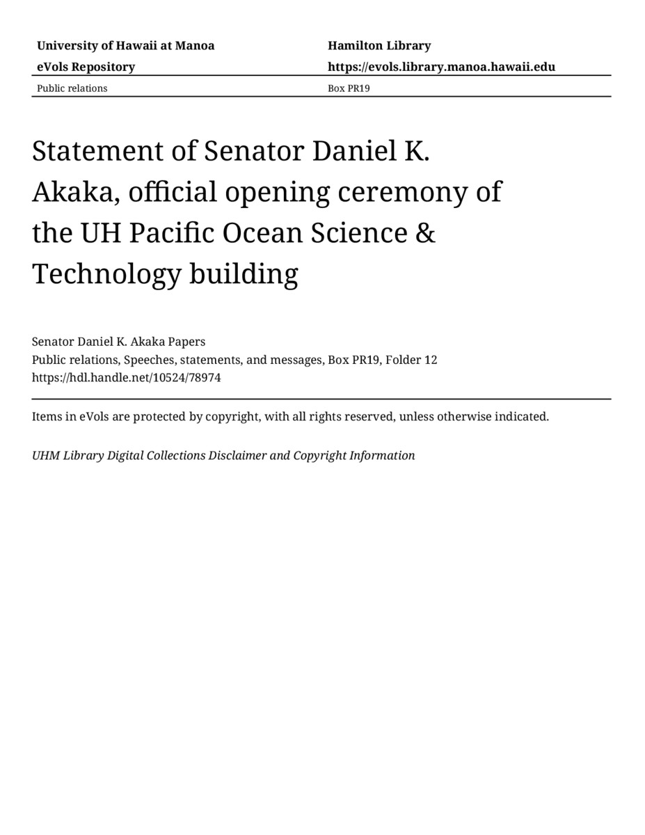 Statement of Senator Daniel K. Akaka, official opening ceremony of the UH Pacific Ocean Science & Technology building, July 2, 1997, MANUSCRIPT-HCPC00010, Public relations, Speeches, statements, and messages, Box PR19, Folder 12, Senator Daniel K. Akaka Papers, Hawaiʻi Congressional Papers Collection, University of Hawaiʻi at Mānoa Library, Honolulu, HI. https://congressarchives.org/catalog/10524_78974 (accessed March 20, 2026).
