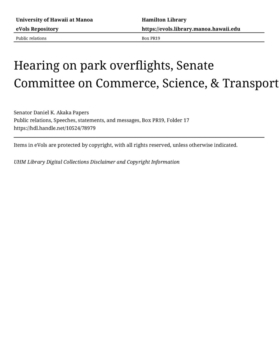 - Hearing on park overflights, Senate Committee on Commerce, Science, & Transportation