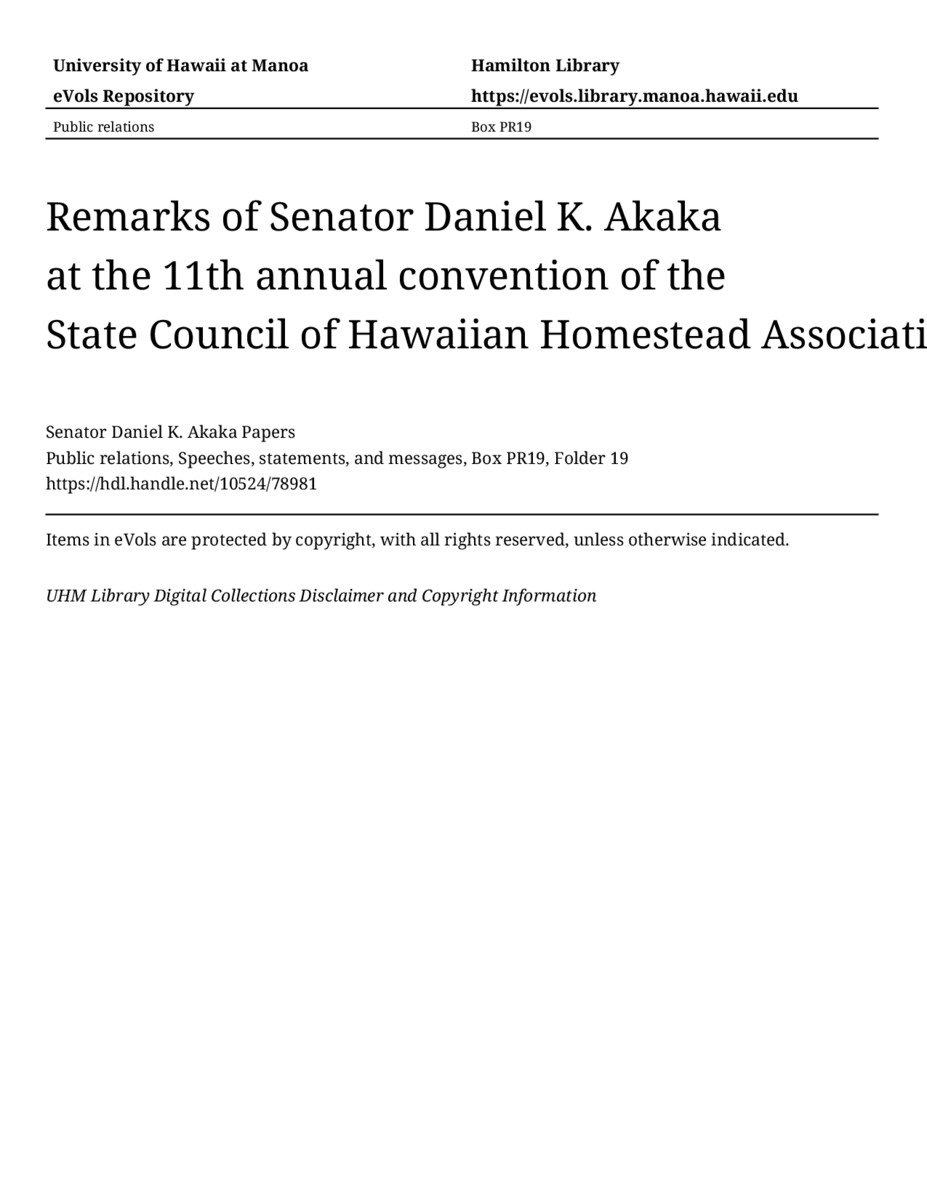 Remarks of Senator Daniel K. Akaka at the 11th annual convention of the State Council of Hawaiian Homestead Associations, August 16, 1997, MANUSCRIPT-HCPC00010, Public relations, Speeches, statements, and messages, Box PR19, Folder 19, Senator Daniel K. Akaka Papers, Hawaiʻi Congressional Papers Collection, University of Hawaiʻi at Mānoa Library, Honolulu, HI. https://congressarchives.org/catalog/10524_78981 (accessed March 19, 2026).