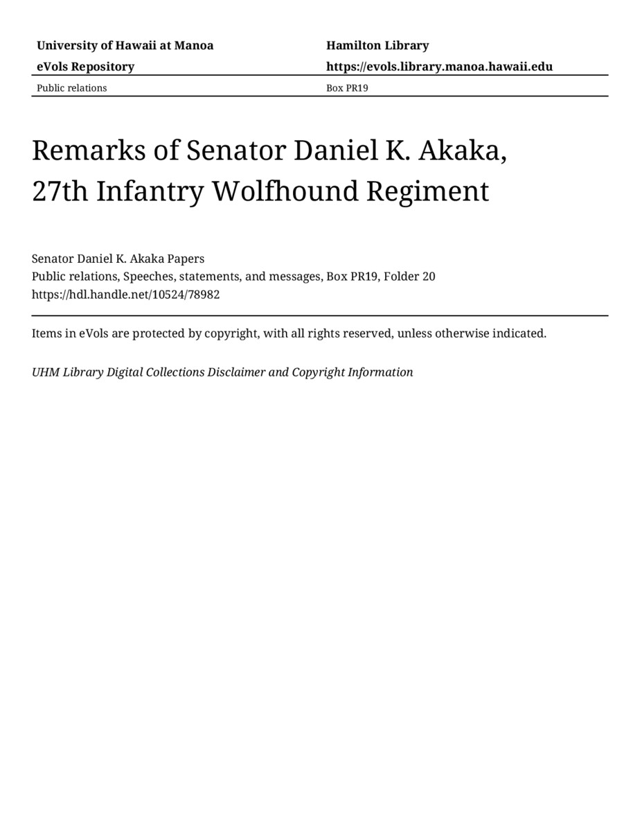 - Remarks of Senator Daniel K. Akaka, 27th Infantry Wolfhound Regiment