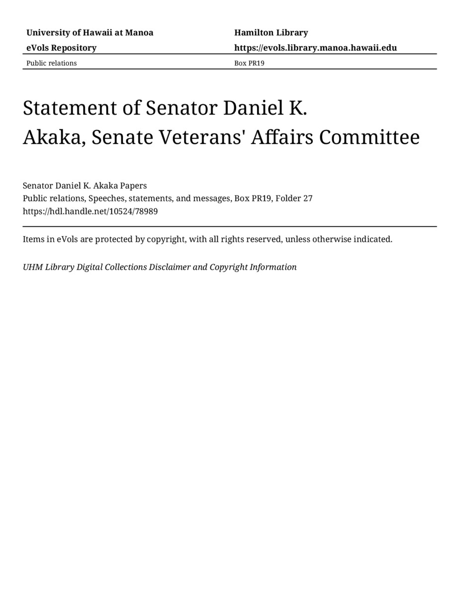 - Statement of Senator Daniel K. Akaka, Senate Veterans' Affairs Committee