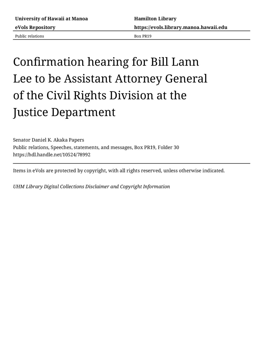 Confirmation hearing for Bill Lann Lee to be Assistant Attorney General of the Civil Rights Division at the Justice Department, October 22, 1997, MANUSCRIPT-HCPC00010, Public relations, Speeches, statements, and messages, Box PR19, Folder 30, Senator Daniel K. Akaka Papers, Hawaiʻi Congressional Papers Collection, University of Hawaiʻi at Mānoa Library, Honolulu, HI. https://congressarchives.org/catalog/10524_78992 (accessed March 20, 2026).