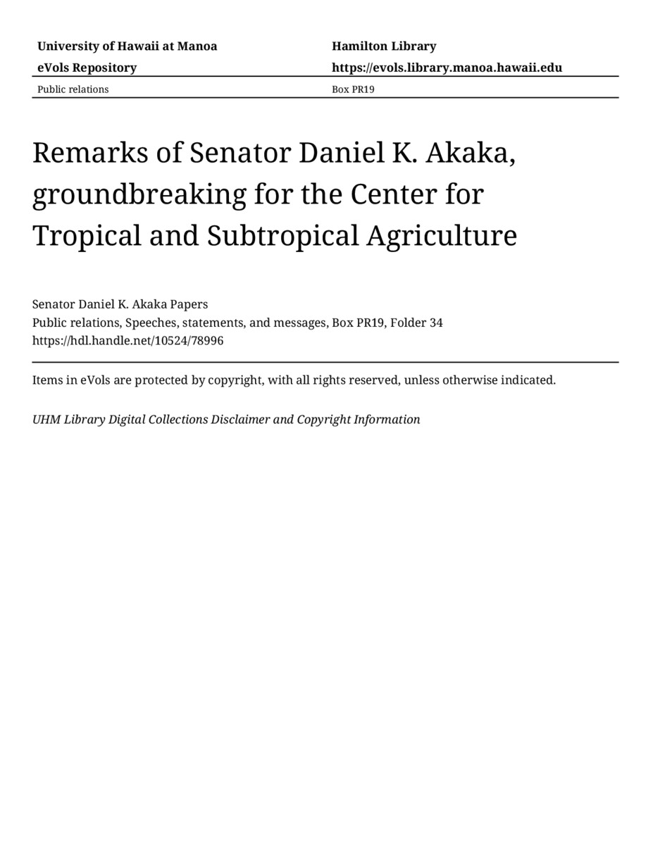 - Remarks of Senator Daniel K. Akaka, groundbreaking for the Center for Tropical and Subtropical Agriculture