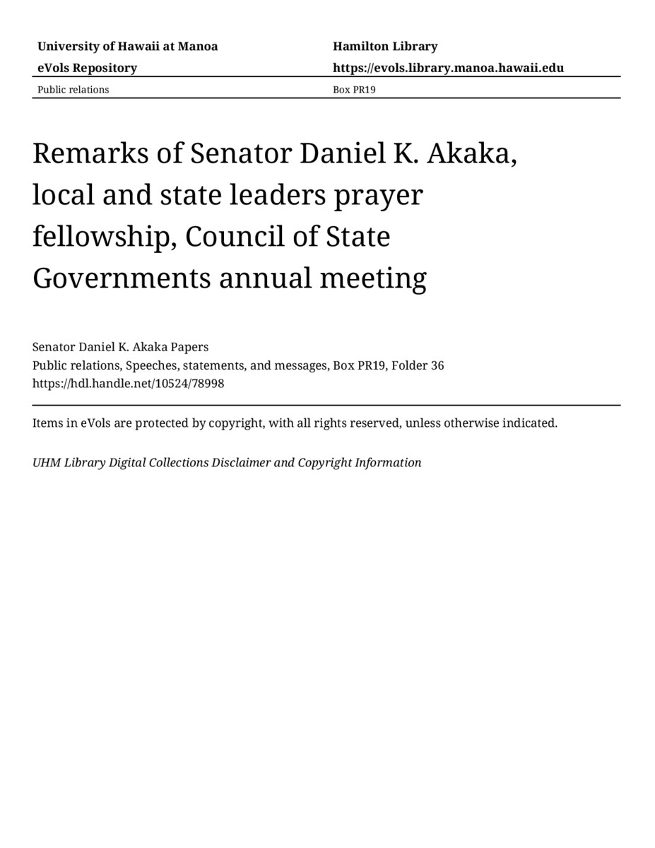 Remarks of Senator Daniel K. Akaka, local and state leaders prayer fellowship, Council of State Governments annual meeting, December 7, 1997, MANUSCRIPT-HCPC00010, Public relations, Speeches, statements, and messages, Box PR19, Folder 36, Senator Daniel K. Akaka Papers, Hawaiʻi Congressional Papers Collection, University of Hawaiʻi at Mānoa Library, Honolulu, HI. https://congressarchives.org/catalog/10524_78998 (accessed March 20, 2026).
