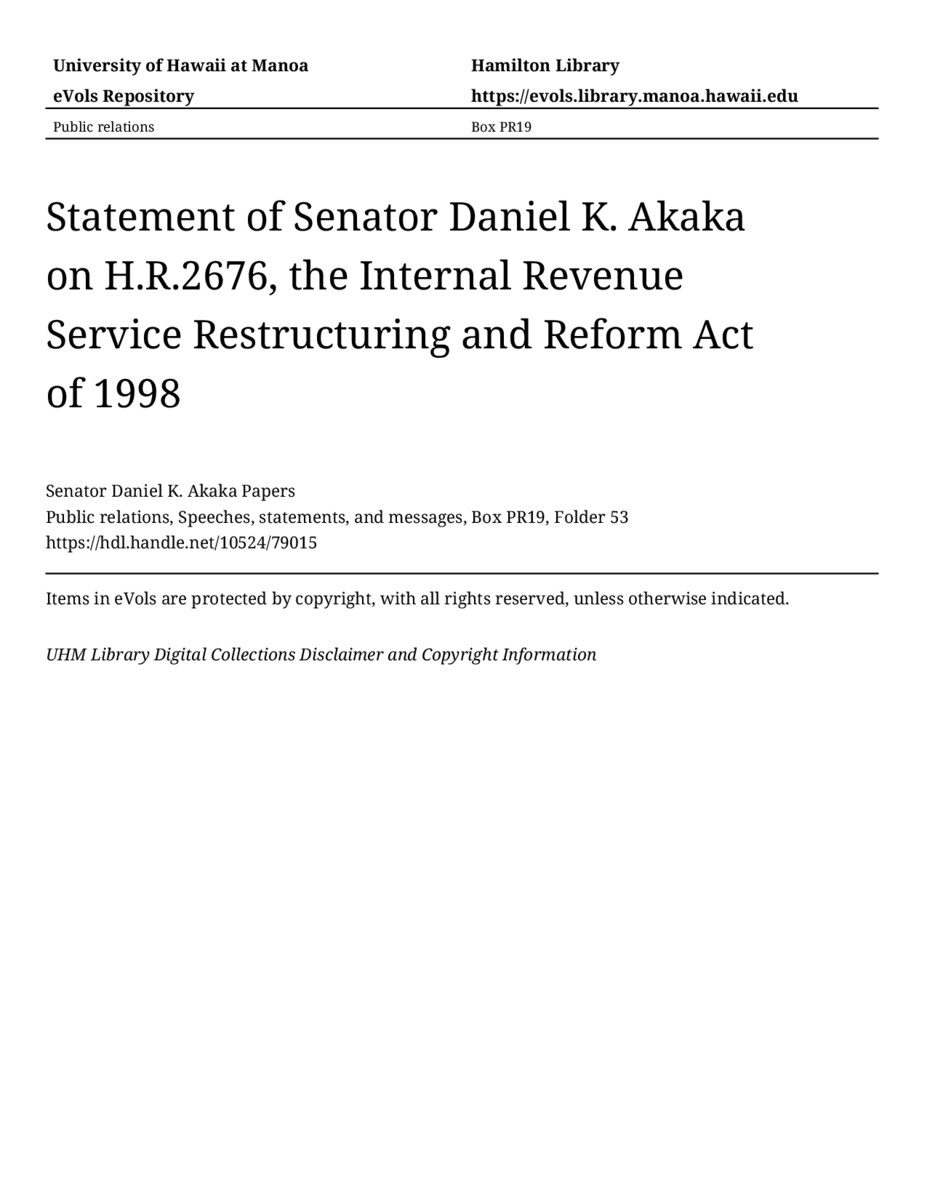- Statement of Senator Daniel K. Akaka on H.R.2676, the Internal Revenue Service Restructuring and Reform Act of 1998