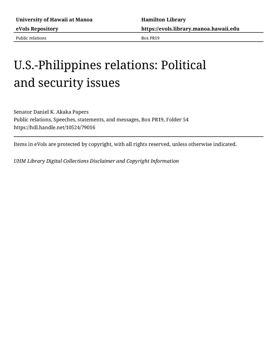 U.S.-Philippines relations: Political and security issues, May 13, 1998, MANUSCRIPT-HCPC00010, Public relations, Speeches, statements, and messages, Box PR19, Folder 54, Senator Daniel K. Akaka Papers, Hawaiʻi Congressional Papers Collection, University of Hawaiʻi at Mānoa Library, Honolulu, HI. https://congressarchives.org/catalog/10524_79016 (accessed March 20, 2026).