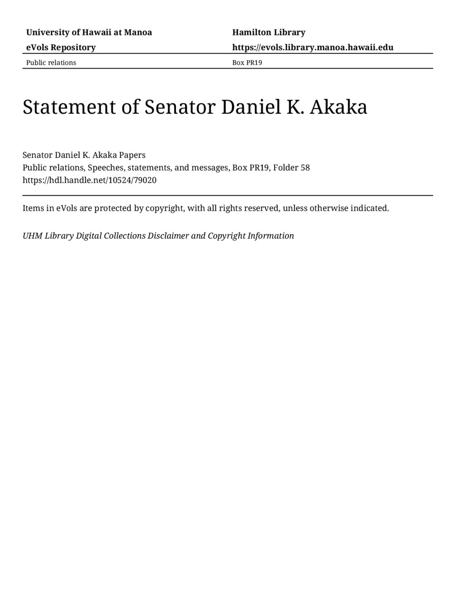 Statement of Senator Daniel K. Akaka, June 17, 1998, MANUSCRIPT-HCPC00010, Public relations, Speeches, statements, and messages, Box PR19, Folder 58, Senator Daniel K. Akaka Papers, Hawaiʻi Congressional Papers Collection, University of Hawaiʻi at Mānoa Library, Honolulu, HI. https://congressarchives.org/catalog/10524_79020 (accessed March 20, 2026).