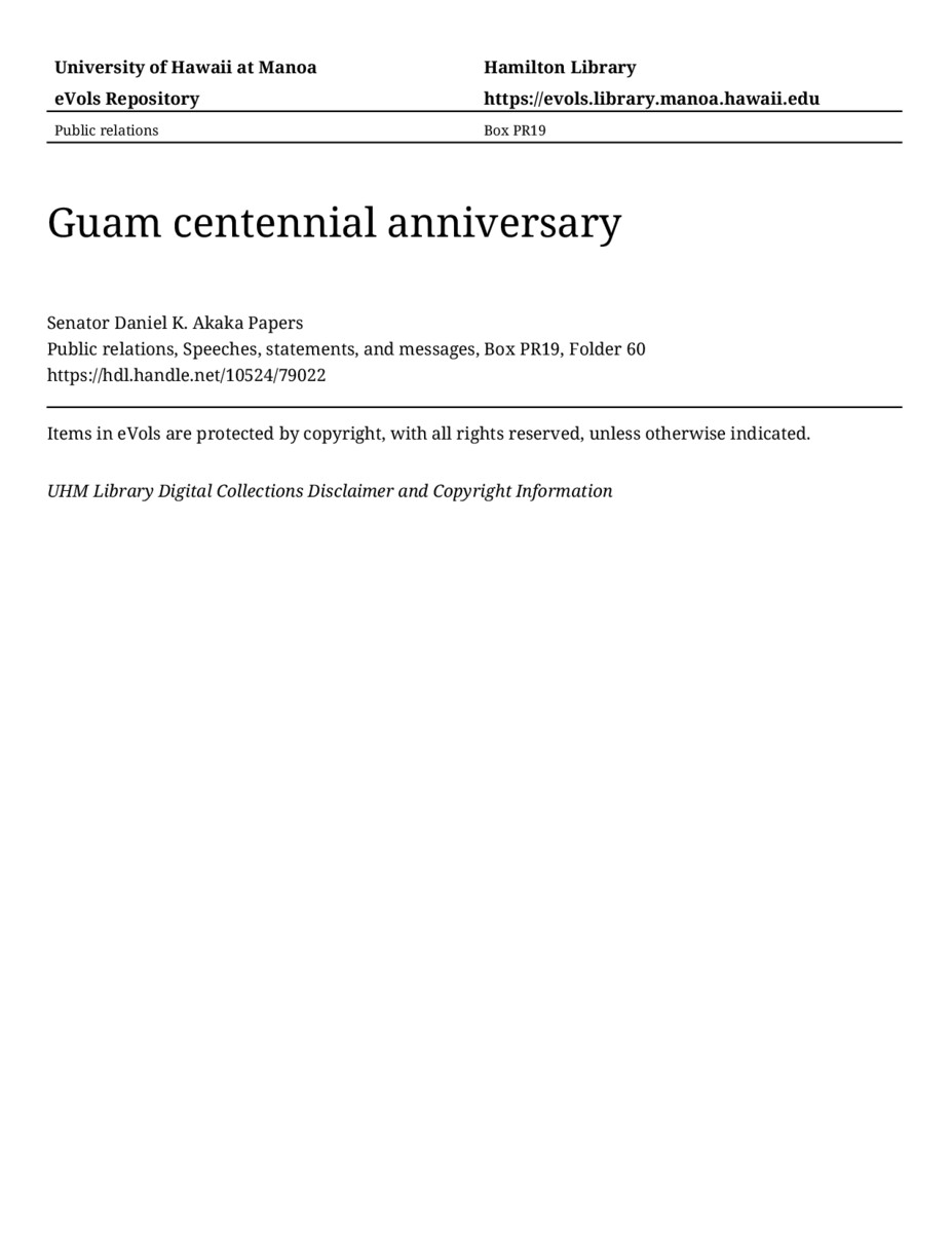 Guam centennial anniversary, June 24, 1998, MANUSCRIPT-HCPC00010, Public relations, Speeches, statements, and messages, Box PR19, Folder 60, Senator Daniel K. Akaka Papers, Hawaiʻi Congressional Papers Collection, University of Hawaiʻi at Mānoa Library, Honolulu, HI. https://congressarchives.org/catalog/10524_79022 (accessed March 20, 2026).