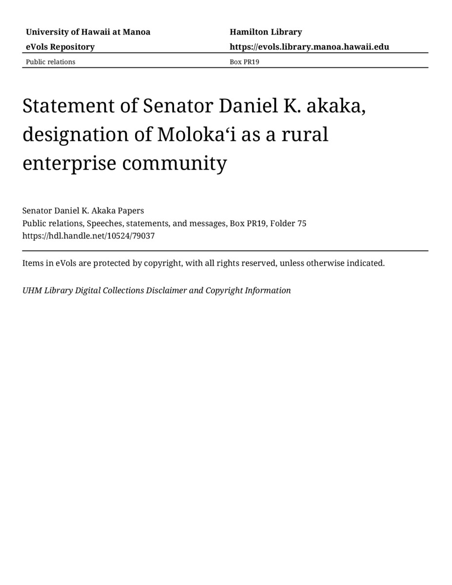 - Statement of Senator Daniel K. akaka, designation of Molokaʻi as a rural enterprise community