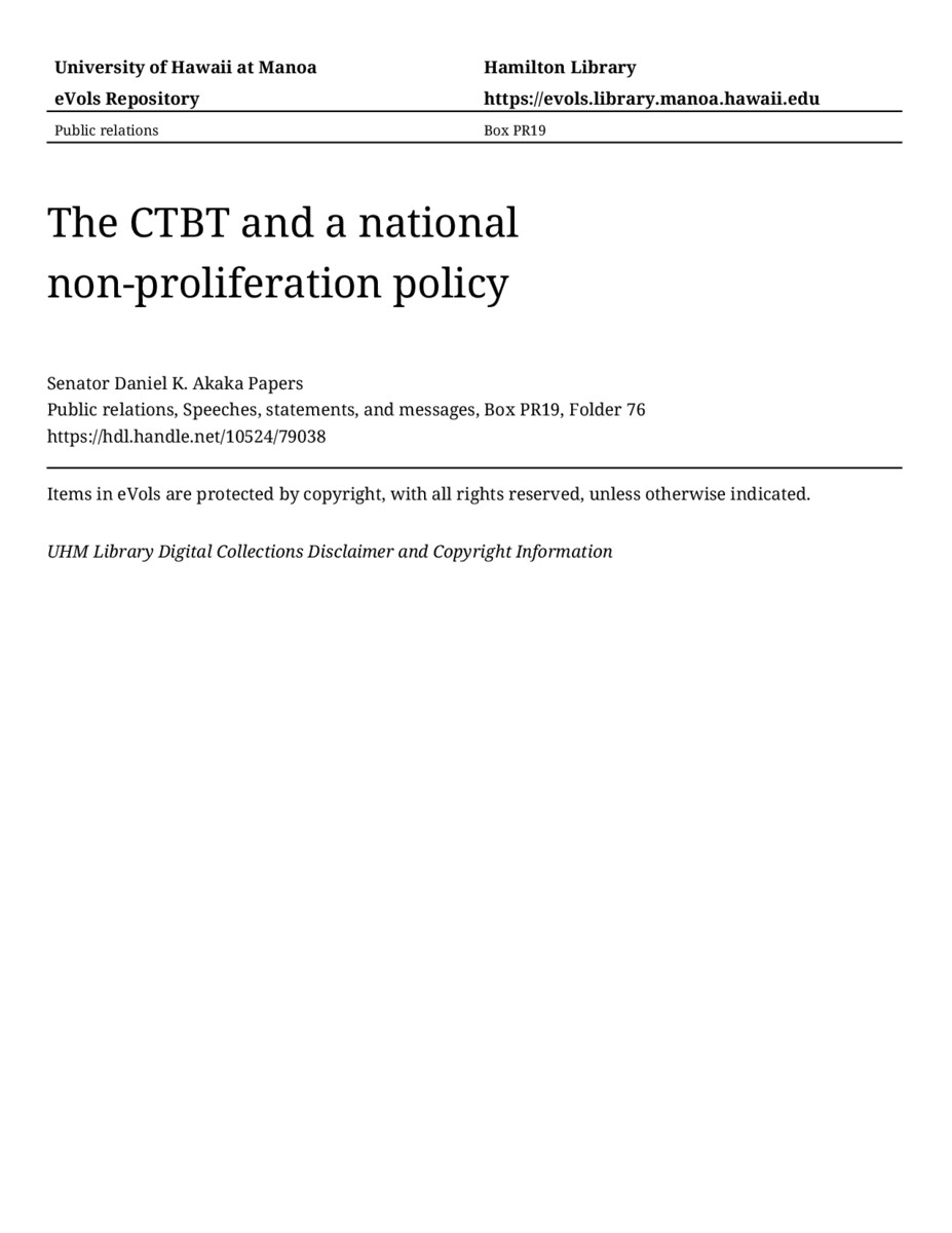 The CTBT and a national non-proliferation policy, February 15, 2001, MANUSCRIPT-HCPC00010, Public relations, Speeches, statements, and messages, Box PR19, Folder 76, Senator Daniel K. Akaka Papers, Hawaiʻi Congressional Papers Collection, University of Hawaiʻi at Mānoa Library, Honolulu, HI. https://congressarchives.org/catalog/10524_79038 (accessed March 20, 2026).