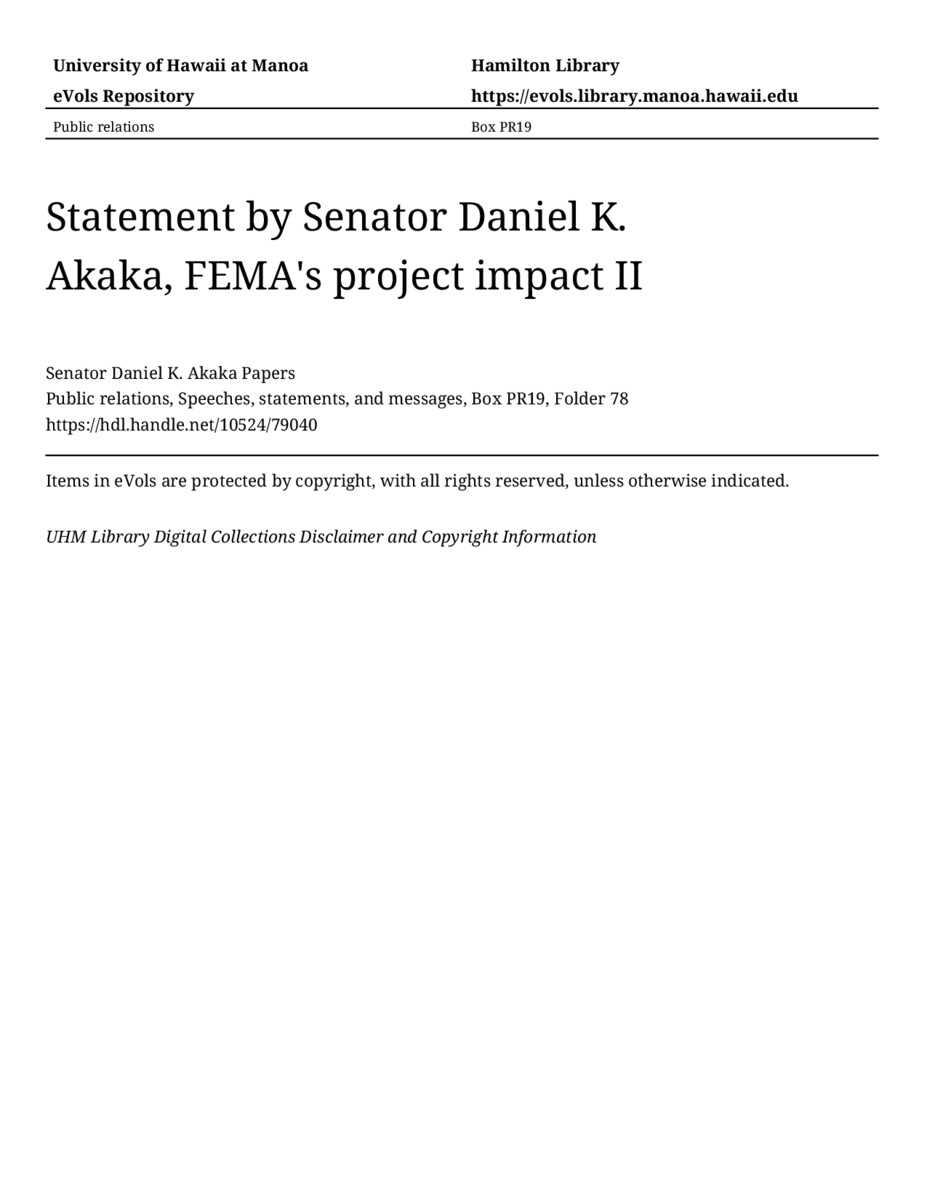 Statement by Senator Daniel K. Akaka, FEMA's project impact II, March 8, 2001, MANUSCRIPT-HCPC00010, Public relations, Speeches, statements, and messages, Box PR19, Folder 78, Senator Daniel K. Akaka Papers, Hawaiʻi Congressional Papers Collection, University of Hawaiʻi at Mānoa Library, Honolulu, HI. https://congressarchives.org/catalog/10524_79040 (accessed March 17, 2026).